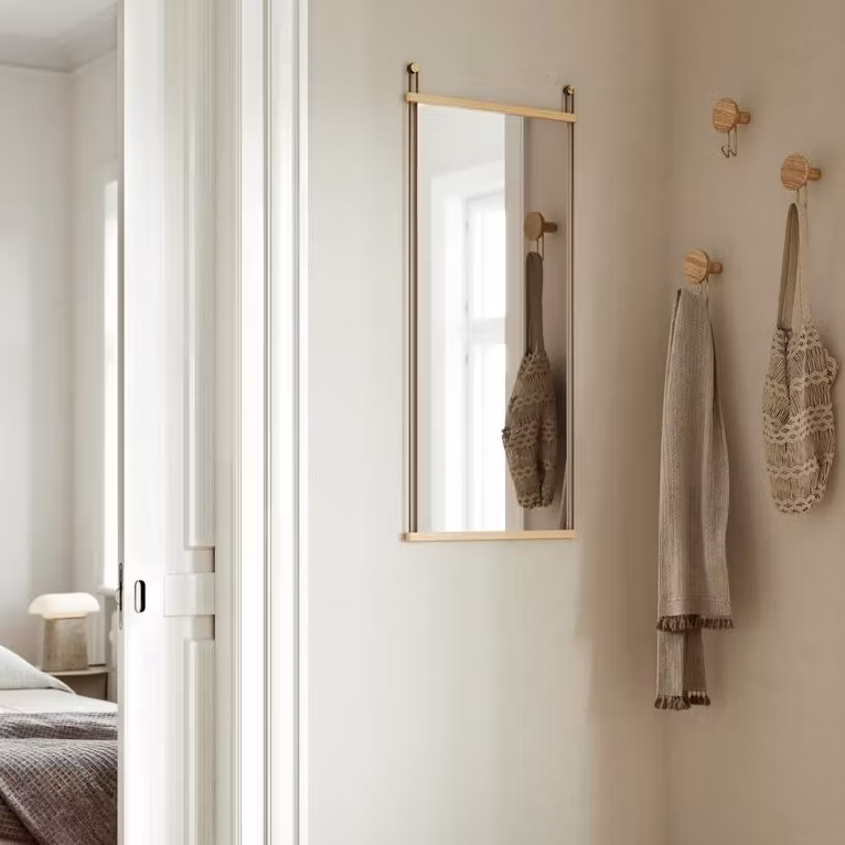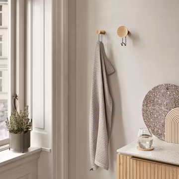 Enkla men grafiska, Around väggkrokar kombinerar intressant estetik och funktionalitet. Den träiga, konkava ytan ger ett skulpturellt inslag till designen samtidigt som den tillför värme och balans till den robusta metallkroken.