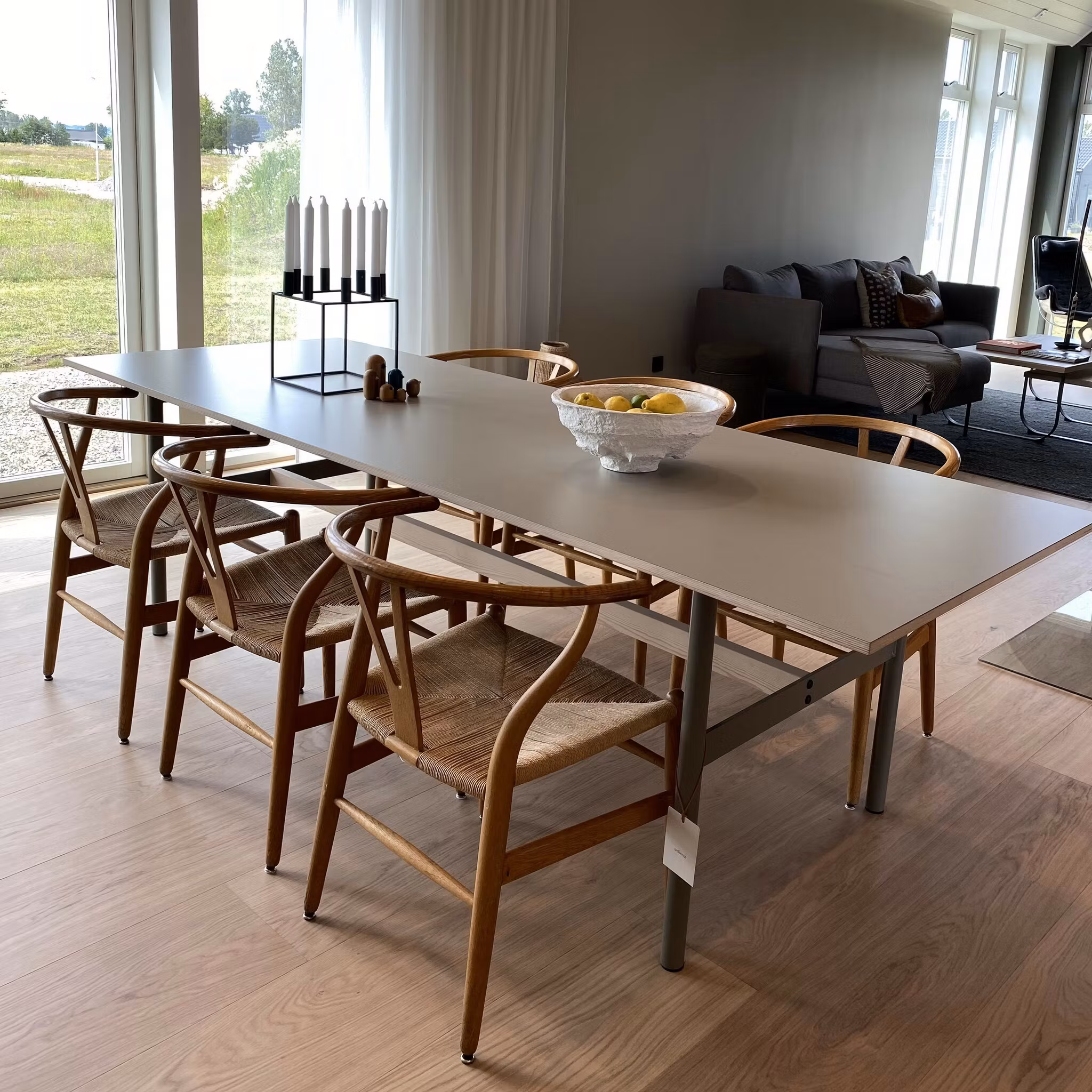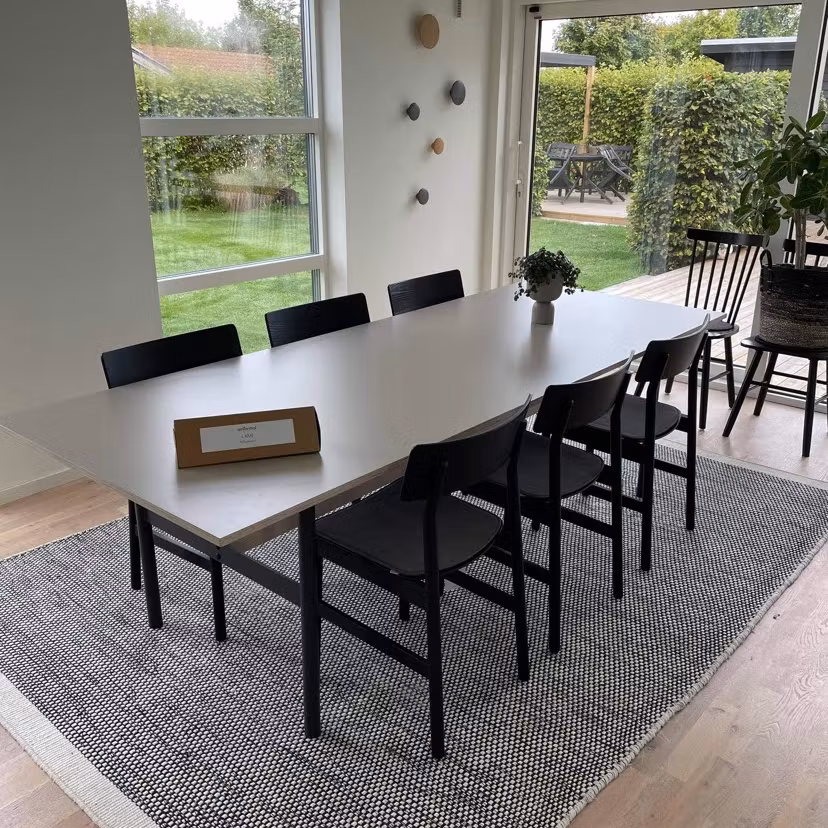 Matbord LAMI från Omformat. Bordet beställs via vår fysiska butik och du som kund kan välja färg på toppskiva, längd och bredd, men även lägga till rundade hörn om du skulle önska. Det finns två olika val av ben - metall eller trä. Toppskivan består av en kärna av skiktlimmat trä med ytskikt av tåligt laminat. Bordet passar även bra som konferensbord.