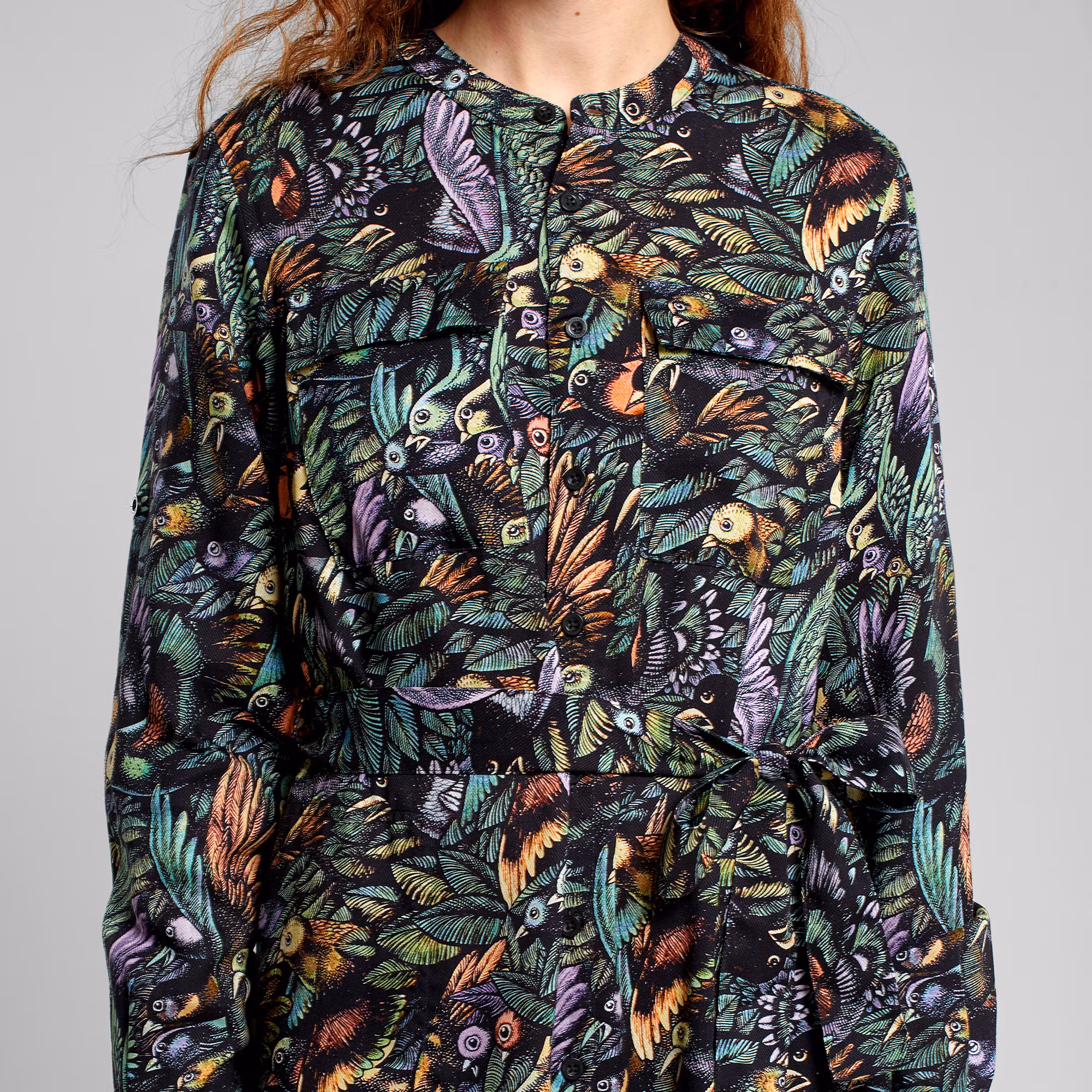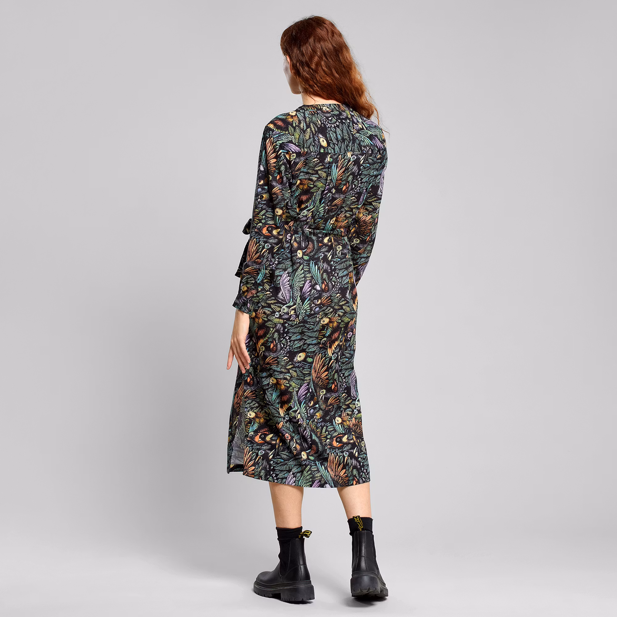 Långärmad midiklänning med bälte i midjan. Knäppning framtill och vid ärmslut.